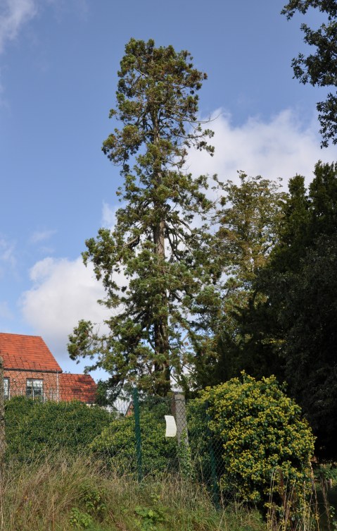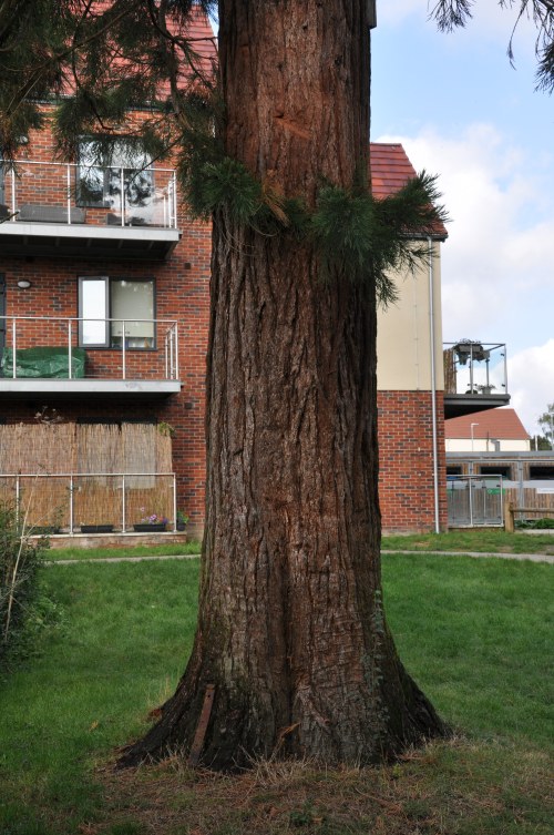 | This rather sparse looking Giant Redwood is adjacent to a pond and a new block of flats. Despite being sparse, the foliage that's present does seem healthy. | |