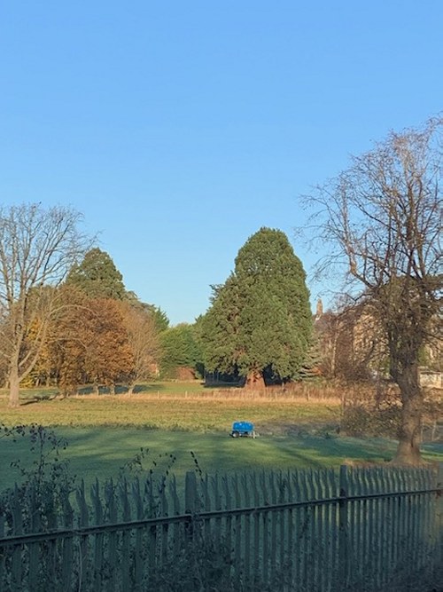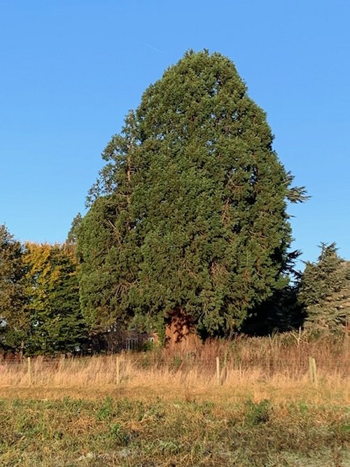| Shane sent theses photographs and wrote; "I noticed these two Redwoods in Sutton Bonington, Station Road, Leicestershire. I think they might have been taller at some point, rough guess about 60 to 70 feet." Thanks Shane, I think you're probably right, the trunk of the tree we can see more clearly in the photographs does look rather wide for the current height of the tree. Also the top of the tree does seem a little offset so perhaps a new leader formed from an upper branch. |
