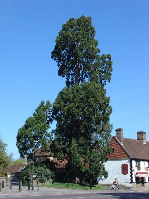 | This Giant Redwood stands just outside the school on North Street, the main shopping street in Midhurst. It is just opposite the footpath that leads to the old Cowdray ruins. I can heartily recommend a visit to both! You can find more details about Midhurst and surrounding areas on the Gravelroots website - a guide to the Rother Valley. |