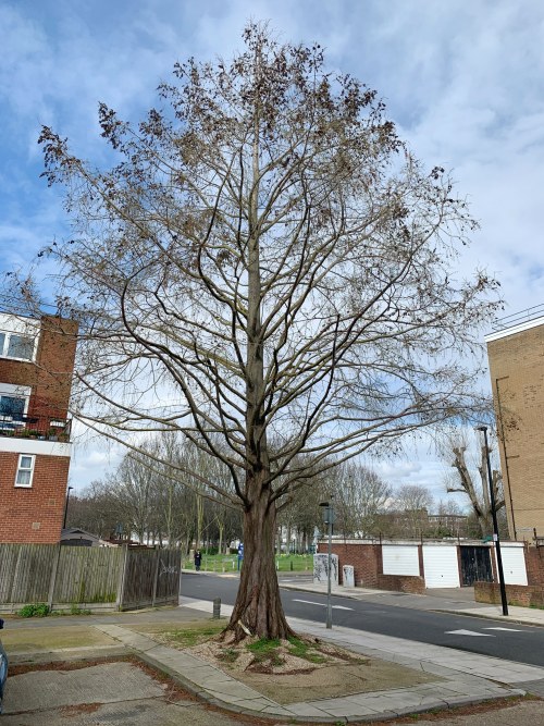 Thanks to Mark who sent this photograph of a Dawn Redwood outside his flat in Bethnal Green.