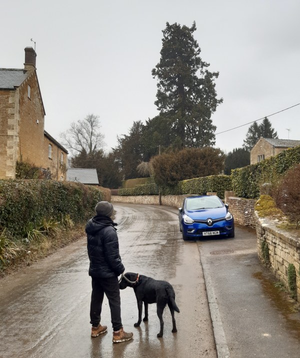 | Thanks to Carla for this photograph of "me and Reg looking at a Redwood in a private garden in Wyck Rissington near Bourton on the Water. It's next to the Church of Saint Laurence, postcode GL54 2PN." |