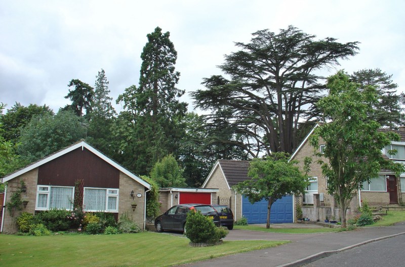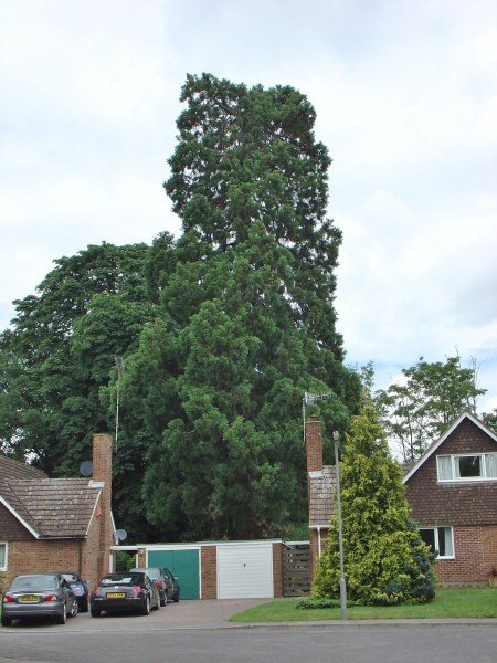 | There are three fine looking Wellingtonia here in the road named Langsmead. These, and one other in the garden of a house facing the main road, were originally part of the Langsmead estate, the original old house having been demolished in the early 1950's. There was a fifth tree in the group, but this had to be cut down after it was badly damaged by lightning on 16th May 1983. All that remains now is a huge stump on a front lawn. I would like to thank the owner of the tree for which measurements are shown, for kindly providing these details and for holding one end of my tape measure! |