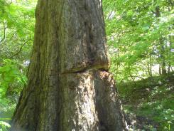 | Another Redwood find for Tam in Castlemilk near Glasgow. He says "I have found another Giant Sequoia in a place called the Bluebell Woods. This is an area of woodland that my father tells me he and his mates used to play in over 60 years ago. It is amazing to think that this tree may have been half it's size back then. These woods are part of the estate that belonged to Castlemilk House. No doubt this tree was planted at the same time as the Buchanan Lodge ones. Sad to say it has been vandalised (see photo) I am not sure how recent the damage is (the cut is no more than 6") but I imagine the tree will be OK. If they can cope with lightning damage then a few local vandals won't beat this magnificent giant. It towers over its surroundings and has a wonderful view over Glasgow all the way to the Campsie Fells on the north of the city." |