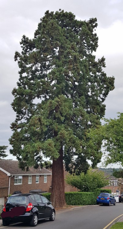 | Thank you to Amanta who sent another Redwood location. She wrote; "As I was driving to a house warming party today at a friend's new home in Loughton, I spotted these two Giant Redwoods from a distance. Upon leaving the party, I decided to investigate their whereabouts. Here is one, right on the pavement outside a house in a road called Hazelwood. The other one seems to be in a resident's back garden. If you go on googlemaps and find Hazelwood in Loughton, you can see the tree comes up along the left as you travel along the road." I would say well spotted Amanta, but it seems this one would be difficult to miss! Nevertheless, a great find. |