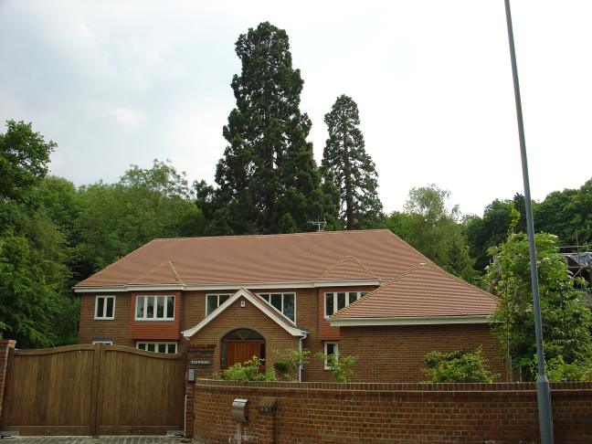 Two fine-looking Giant Redwoods stand at the back of a house that is appropriately named "Redwoods", in Burfield Road.