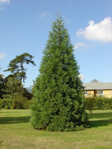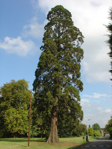 | Almost twenty or so Giant Redwoods can be found in a few square miles around Broomfield, north of Chelmsford. There are three of these trees at the Early Years and Childcare Resource Centre, Broomfield Place in Main Road. The first picture was taken on a misty Spring morning and the eerie atmosphere created by the mist enhances the prehistoric feel of these magnificent beasts. The second picture shows the same vista on a late Summer afternoon. The tree in the last picture, although planted a little close to one of the older trees, is a very fine example of a very young Wellingtonia with a classic conical shape. |