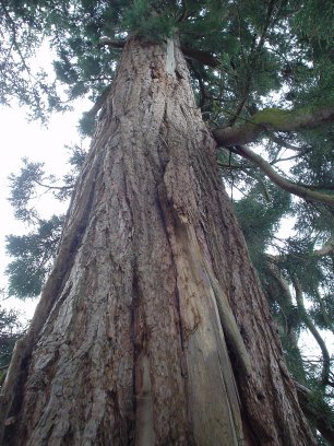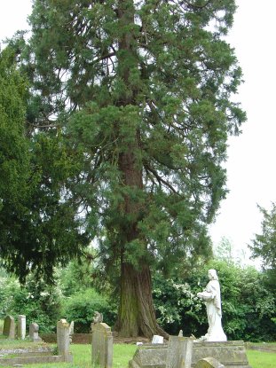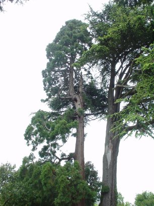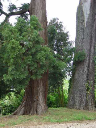 | There are two Giant Redwoods in Bures cemetery. One has been hit by lightning some time ago. Even the wood has split, but its wounds are healing and it looks as though a side branch has taken over as the leader at the top. The large cedar standing beside it was scarred too, perhaps by a falling branch. |