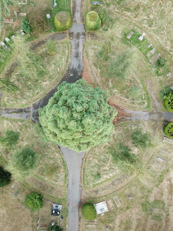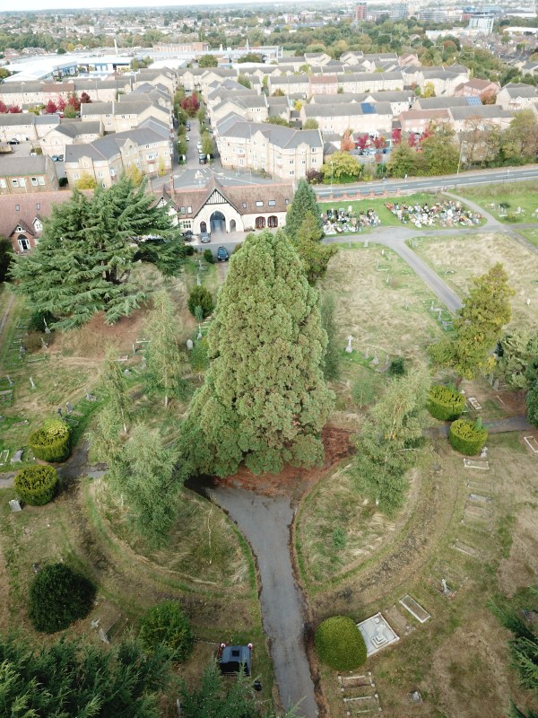 | Fantastic photographs of the Giant Redwood (Sequoiadendron giganteum) in Chelmsford Cemetery in October 2018. They were taken along with my son Peter using a drone and they really give a different persepective showing the huge size of the Redwood in comparison to other trees nearby. It was probably planted around 1886 when the lodge was built, so it's really just a baby. |