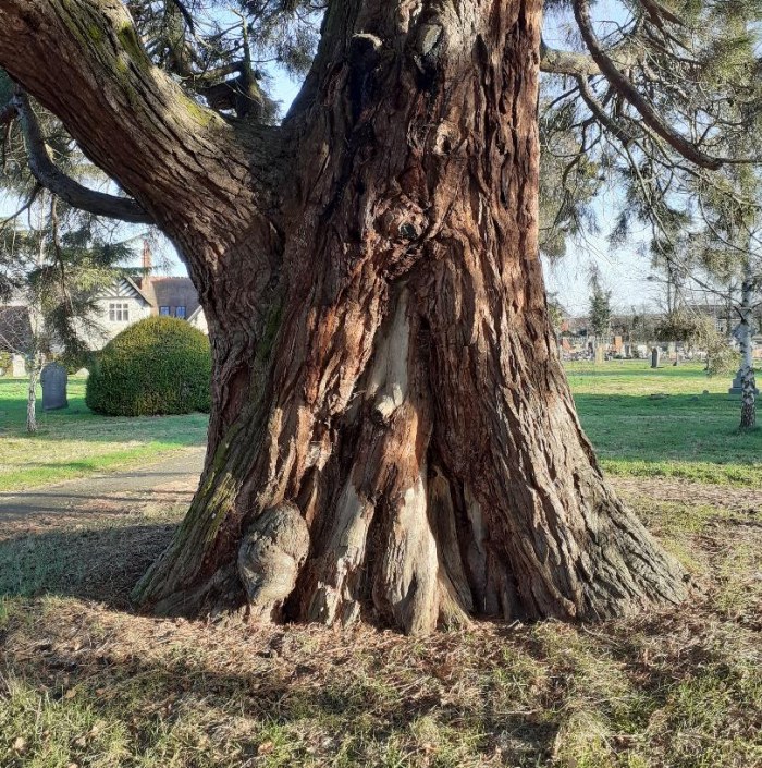 | Thanks to Paul for this photograph of the Giant Redwood in Chelmsford cemetery. It is interesting to comparing this picture to the photograph taken in August 2009. Paul also provided us with a girth measurement, measuring at 1.5 metres above ground; Survey date: 08/02/2022 - 5mtr 52cm |