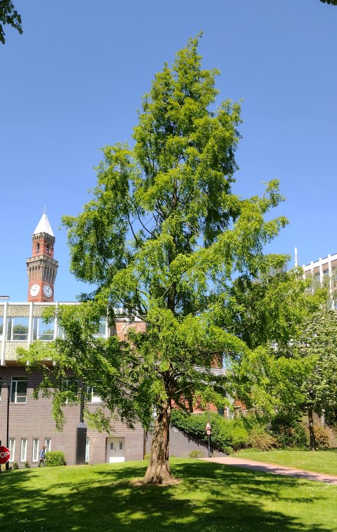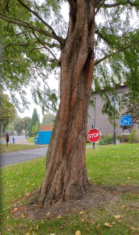 | In September 2022 George found a Dawn Redwood on the University of Birmingham campus to complete the set of three types of Redwoods. He wrote; "This Dawn Redwood is just up the road from the second Wellingtonia in the area. It is quite a short tree, but it seems to be very young so there is a great deal more growth to be had. It’s co-ordinates are 52°26'54.1"N 1°55'43.6"W." |
