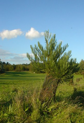 | Five of the original saplings were placed either side of the fairway at Hole number 5. The left hand picture above shows them all a year after they were planted. The right hand picture above shows them another year on when five of the trees were relocated to form a continous line veering around and up the right hand grass mound. Unfortunately eight of the trees have since died, either they were too small to plant out, they did not survive the move, or a lack of water seeming to be the culprit. The largest of the survivors is nearest the teeing area and so may have been able to tap into the extra water that is lavished on the grass at this point. |