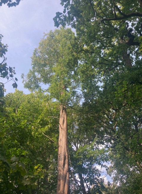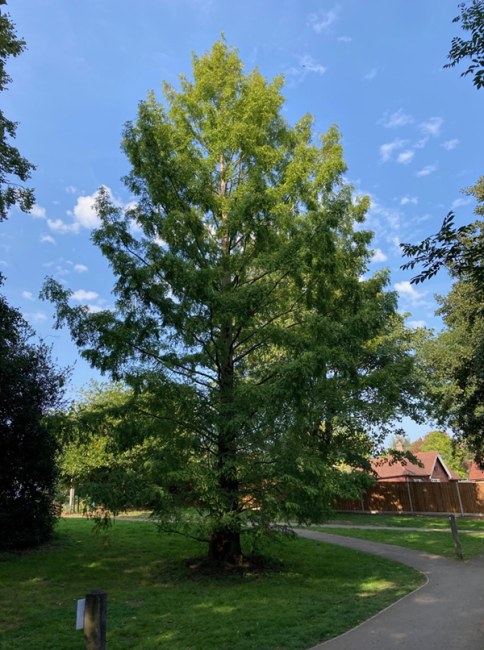 | "The tallest Dawn redwood tree I know of – it's about 30m tall. Although the girth is comparatively small at only 2.43m. This tree is a bit off the path but close to the road, which is where I first spotted it." |