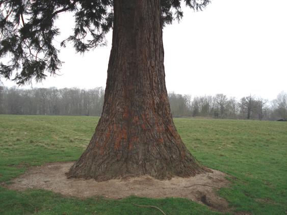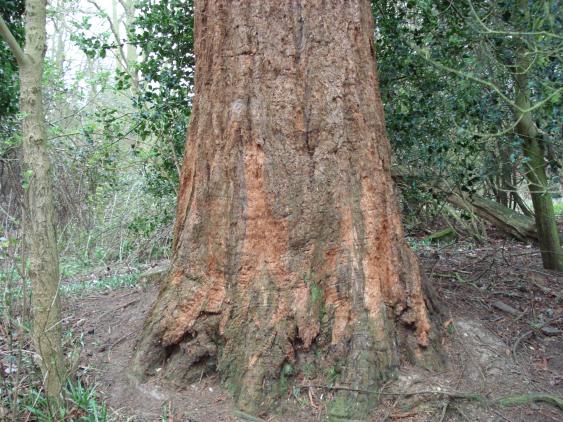 | A brisk walk from the entrance of Dagnam Park at Settle Road, a lone Wellingtonia stands in the middle of a large field. This tree is mentioned on the Dagnam Park - remembered page of the Friends of Dagnam Park web site. On this site you can also find out much more about this park, which was once part of a large estate owned by Richard Neave in the 18th century. The second tree stands in a rather confined location in the middle of a clump of other trees, a little way off from the main tree. It has suffered some damage over the years, as can be seen from the photograph, but is nonetheless soldiering on. The park certainly appears to have be plagued over recent years by various forms of vandalism. The society was set up "on the 2nd May 2003 when a whole lot of angry Harold Hill people sat in the audience bursting to have their say about the way their enjoyment of the park had been destroyed by a handful of anti-social illegal motorcyclists." |