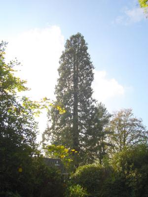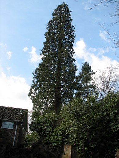 | Jerry has found a good number of Redwood trees in Sussex and he also spotted this one in Haslemere. He says "The Haslemere Giant is in the back garden of a house in Farnham Lane. I'm pretty sure that it doesn't feature amongst the other Haslemere Redwoods on your website." Thanks Jerry for clearing up the name of the road where this tree is situated. The split at near the top of the tree can be seen in both photographs. |