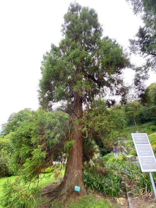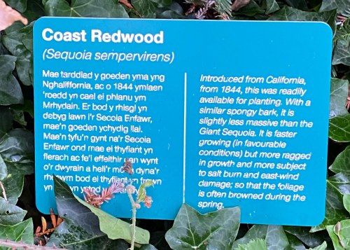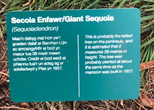 | Thanks to Paul for sending these photographs to us, he wrote in December 2021; "There is a Gallery and Tea Room at Llanbedrog, Pwllheli, Gwynedd in Wales called Plas Glyn-Y-Weddw. In the grounds there is a huge Giant Redwood and several Coast Redwoods. I always make time for a visit while holidaying in nearby Abersoch. The Giant Redwood was planted in 1857 and the Coast Redwood in the photograph is the biggest of several Coast Redwoods in this location." |