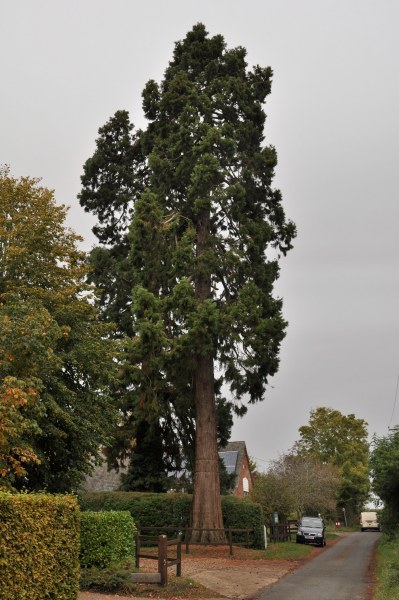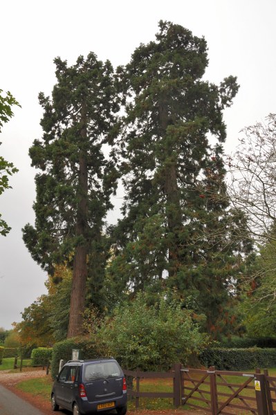 | The lefthand Giant Wellingtonia is in the Old Rectory and the righthand tree stands in the Village Hall grounds, both are adjacent to the St John The Evangelist church. |