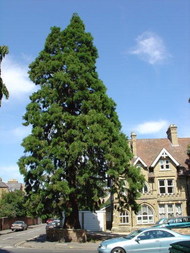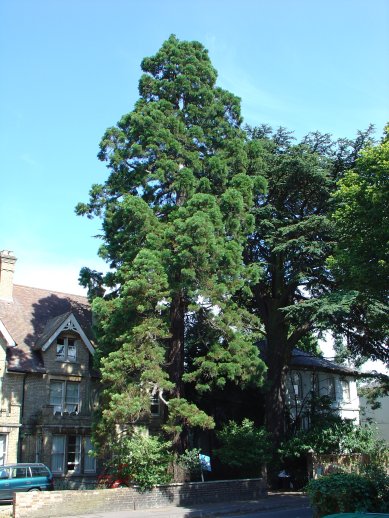 | At the front of this house in Iffley Road stands a nice pair of Giant Redwoods. James wrote in June 2019 to tell us that "I lived at 235 Iffley road from 1946 to 1972 and know the redwood and cedar that were in our front garden. The redwood in front of 233 Iffley Road was damaged by the cold weather of the 1962-63 winter and the top died out. A side shoot sprang up and the tree then started to grow more vigorously than the one in front of 235. I suspect our tree (235) suffered from competition for water by the other redwood and the Cedar. At some stage there was a large branch which over hung the road, this began to die and had to removed. It is quite interesting to see these trees in your register. We could always locate our house from the hills around Oxford, Boars Hill, Wytham woods and Shotover thanks to our trees." It's always good to receive tales from people having a past connection with the Redwoods featured on the website, and it's interesting to hear a little of its history. |