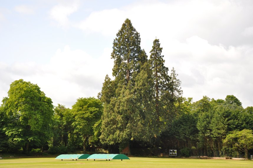 | Possibly the largest of the Giant Redwoods in Shipton-under-Wychwood stands in the cricket ground. It does have one or two large branches that veer upwards but the other stems on the righthand side of this tree are two of the Redwoods in the Tall Trees Care Centre. |