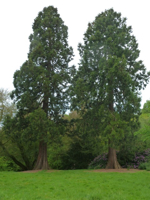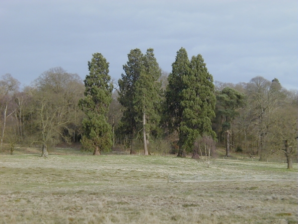 | Thanks to Ian for the above photograph of two of a number of others he found nearby. He said that "I see from your site that you have a group of redwoods identified in the ice house field at Clumber plus two more near the crossroads. I'm not any sort of expert on these smashing trees, but I think I've found seven more in the hilly area between the chapel & shops and the bridge over the lake." |